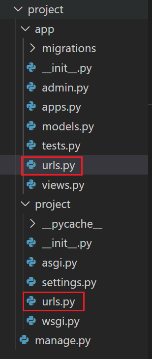 次に、アプリケーション(app)にurls.pyを作成し、以下のように記載する。