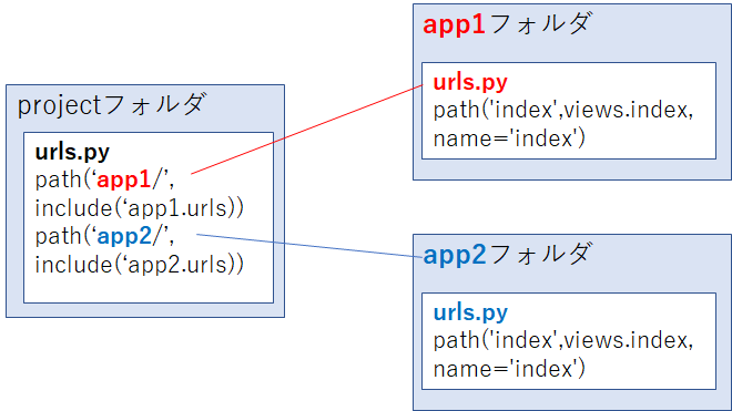 path('app1/', include('app2.urls')),#app2に対するマッピング