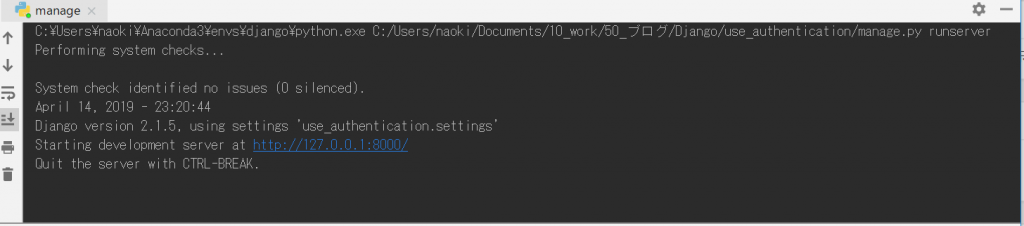 - 画面からmanage.pyの設定を選択して、▶を押し実行する。