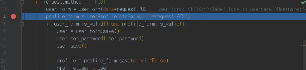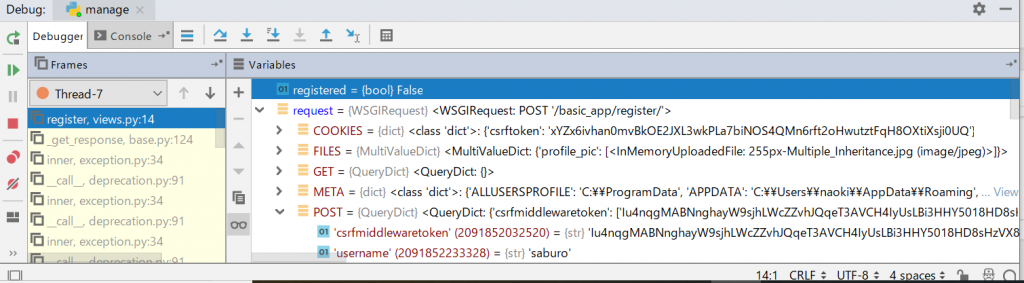 - Debug実行後、プログラムが走る部分を画面遷移するとPycharm(IntelliJ)上でプログラムがストップし状態を確認できる。