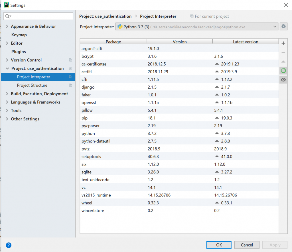 - まずは、Pycharmでpythonを動かす際に、Djangoで使用するpython virtual environment(venv)ように設定する必要がある。その設定は、以下のようにFile→Settings→Project:project_name→Project Interpreterに移動する。