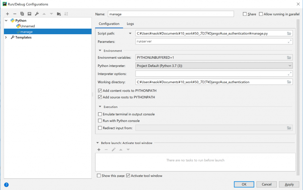 Runボタンでmanage.pyをrunserver付きで実行するように引数の設定を入れる