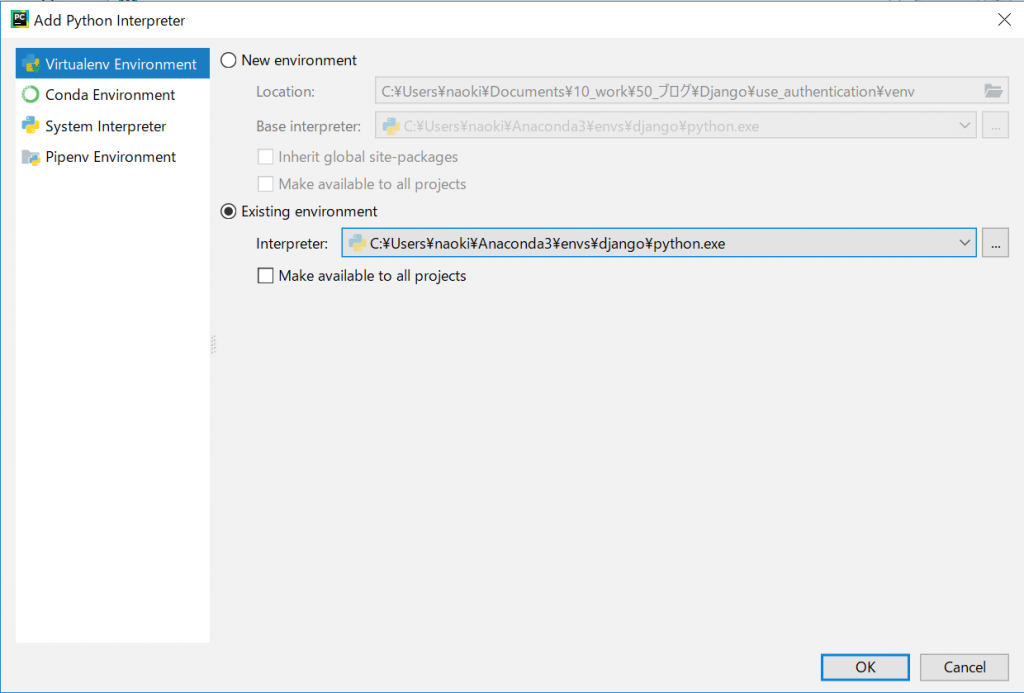 - 遷移先の画面で、「existing environment」を選択し、Base Interpreterの横の...をクリックし、使用しているvenvのpythonのパスを指定する。(Anaconda/envs/env名/python)