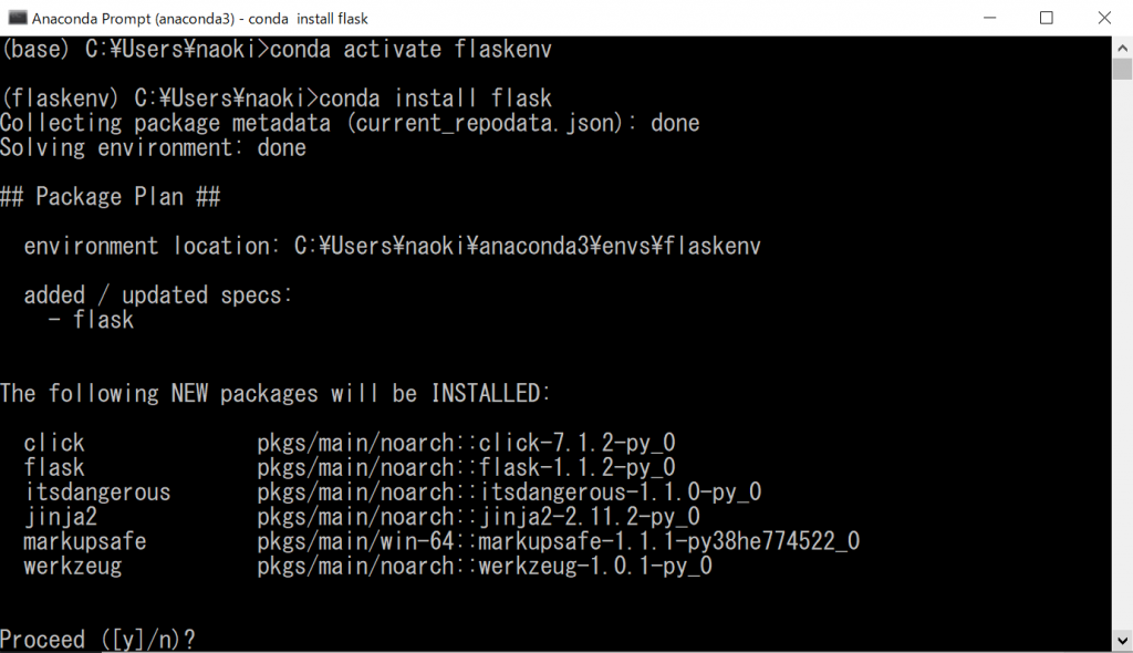 パッケージをインストールする場合、conda activateで仮想環境をアクティベートしてconda installを実行する