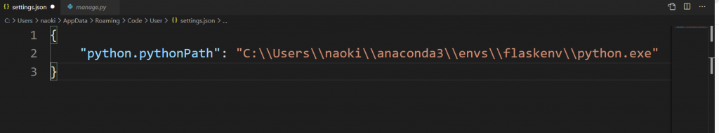 画像の例だと、pythonenvという環境でパスはC:¥Users¥naoki¥anaconda3¥envs¥flaskenvとなっているが、これの¥を\\にして、これに\\python.exeを追加して、設定ファイルに"python.pythonPath": ""の""の中に入れる。
