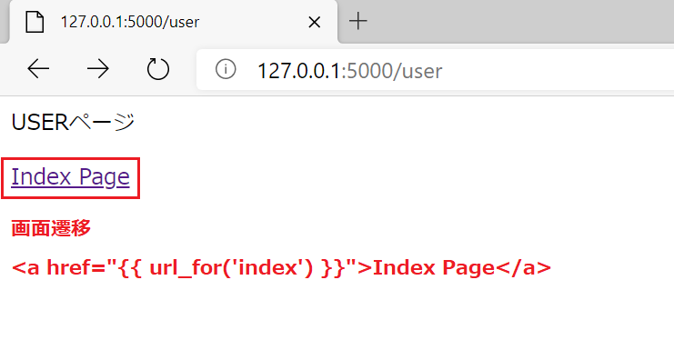 <a href="{{ url_for('index') }}">Index Page</a> <!-- views.pyのindex関数を実行するリンク -->