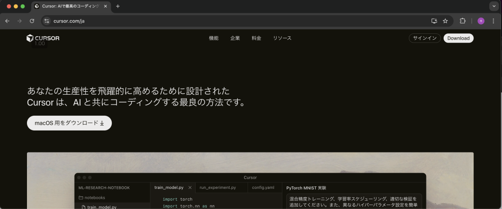 ポイント:CursorはVSCodeベースなので、既存のVSCodeユーザーにとって馴染みやすいインターフェースを提供している。