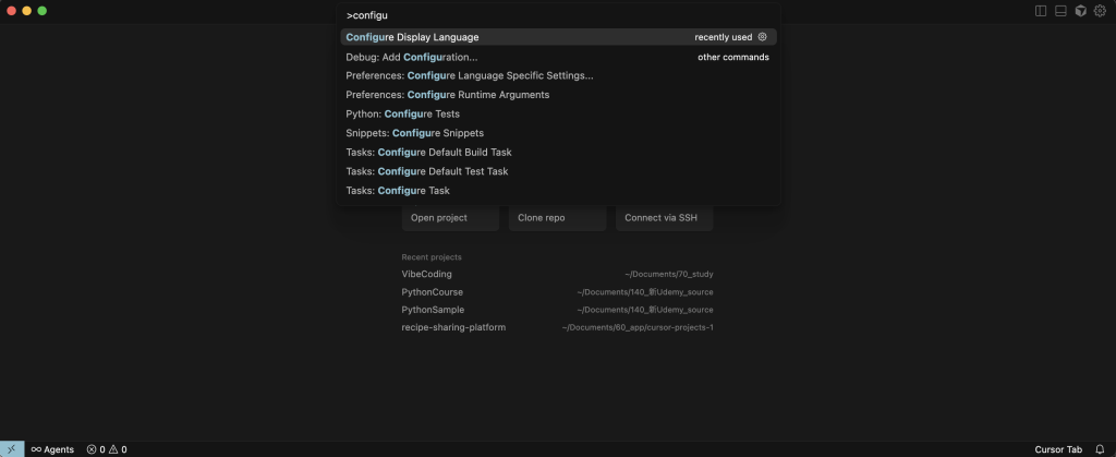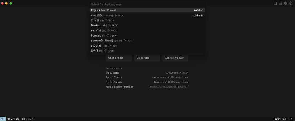 上がCursorの画面だ。VS Codeの利用者からすると馴染みやすいだろう。とりあえず日本語化をしよう。