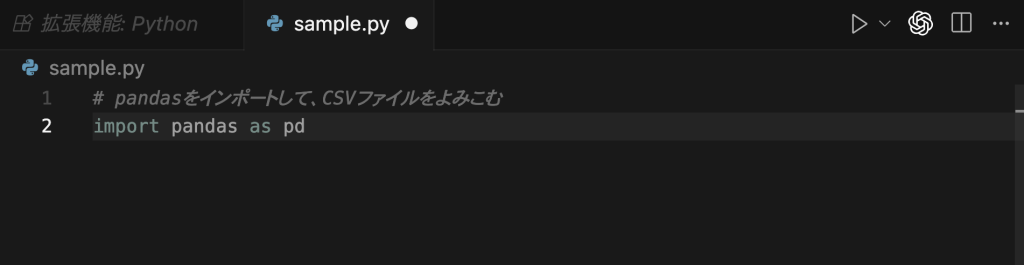 以下の例では、pandasを読み込むようにコメント文で記述した。改行するとそのコードをそのまま出力してTabを押せば補完できる。