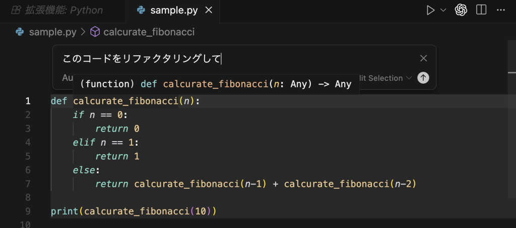 この例では、カーソルを最後に持ってきてctrl+Kを押し、「ユーザーの入力した数値のcalculate_fibonacciを実行するコードを書いて」と入力した。