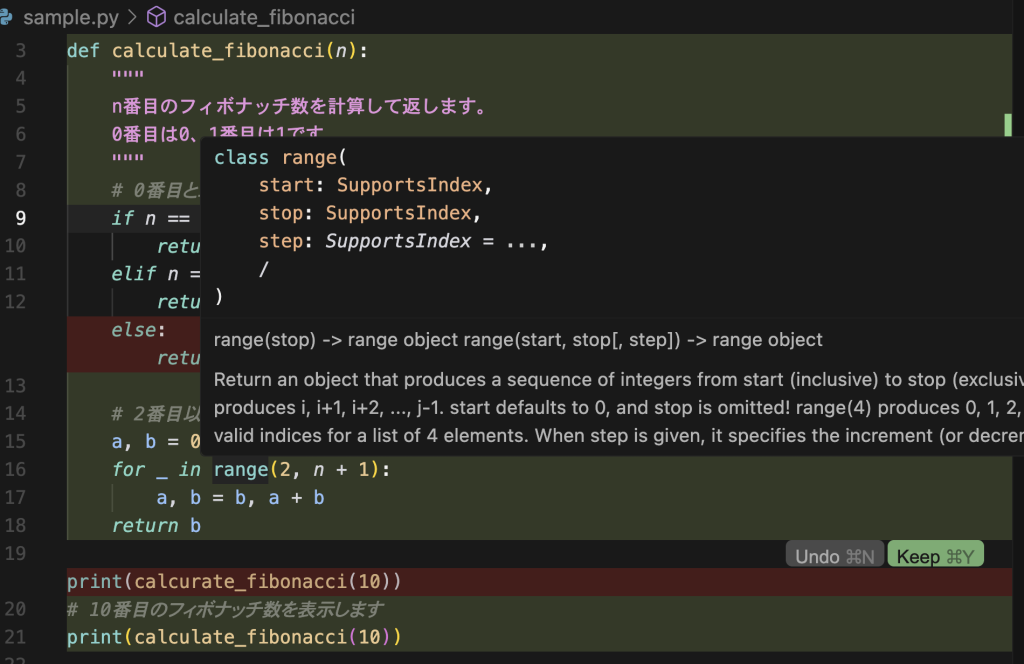 このコードでは、calculate_fibonacci(n):以外は全て自動で書けた。