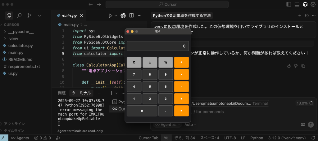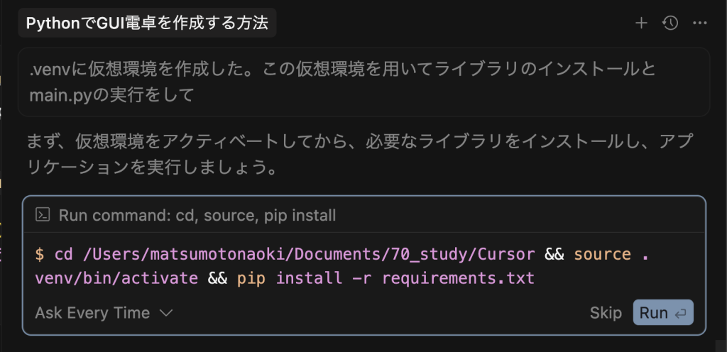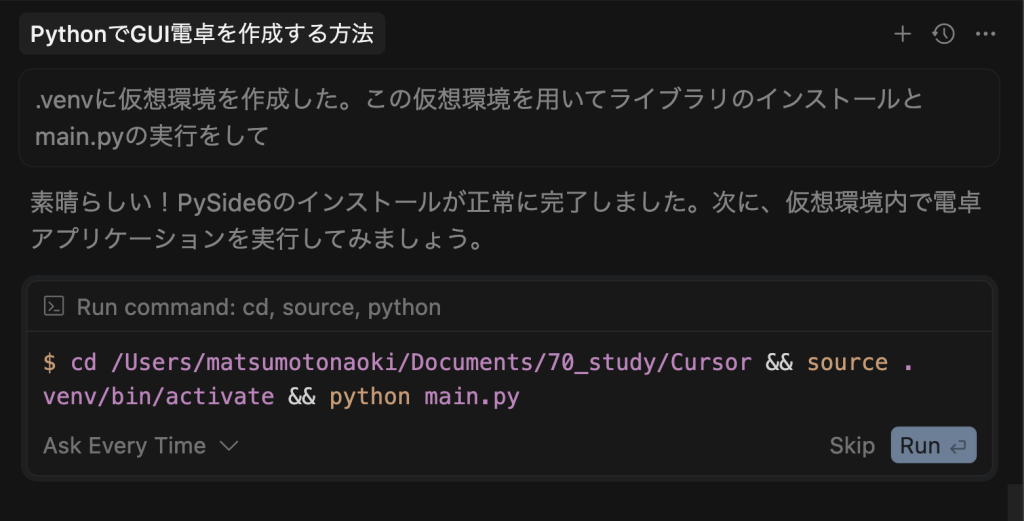 コードが作成され、Python仮想環境のセットアップが完了したので、いよいよPythonファイルの実行をしたい。 その前に外部ライブラリのインストールをAgentに指示し、今回作成したmain.pyを起動する。
