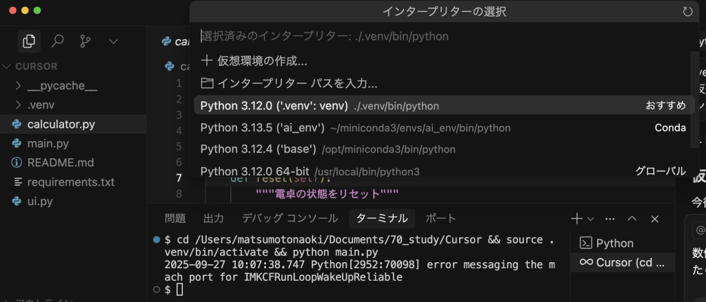 今回は、.venvを仮想環境として作成した。以下のように「.venv」が作成されてインタープリターとして選択されている。