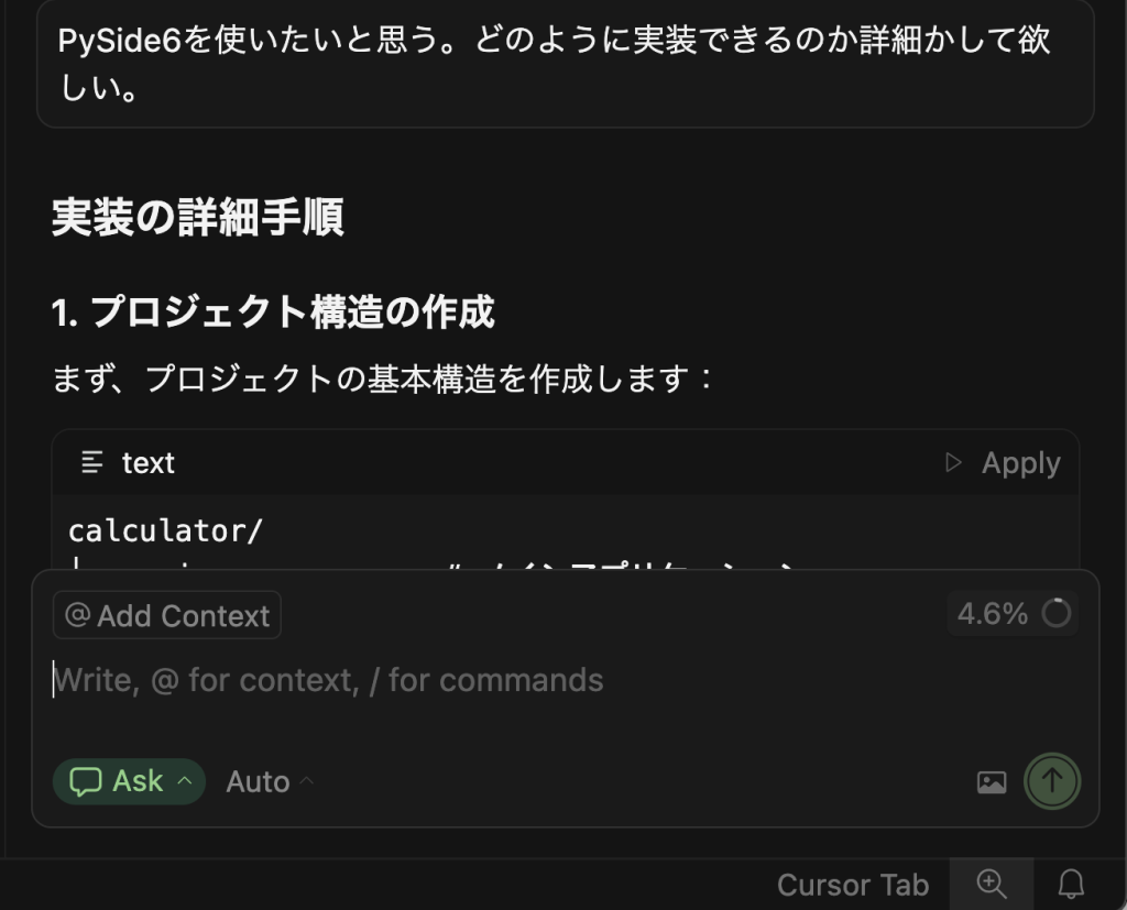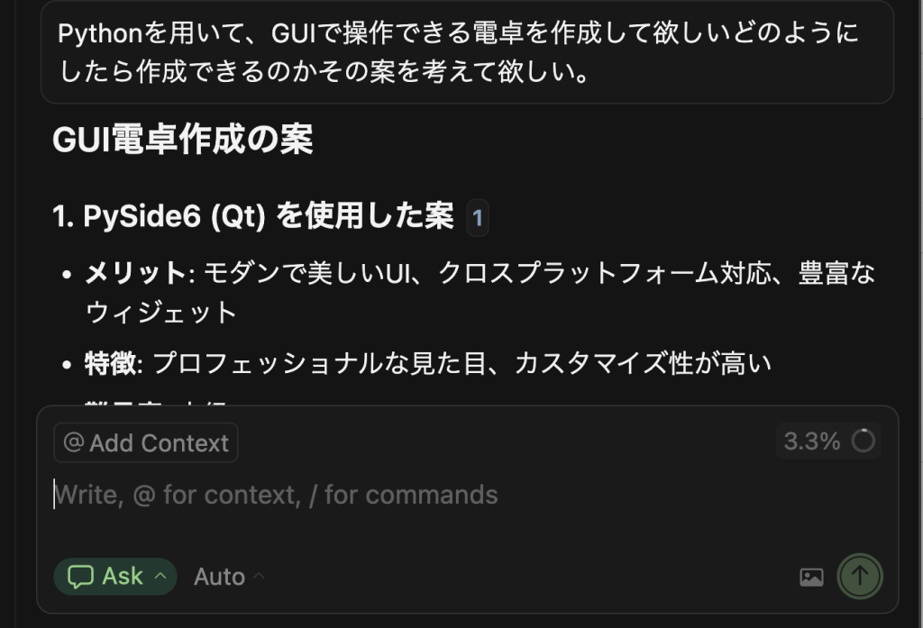 このうちAskはコードの編集や実行などは行わないため、まずこのモードにした状態で編集計画を出力させるとよい。