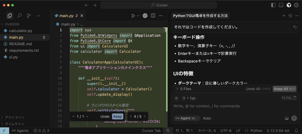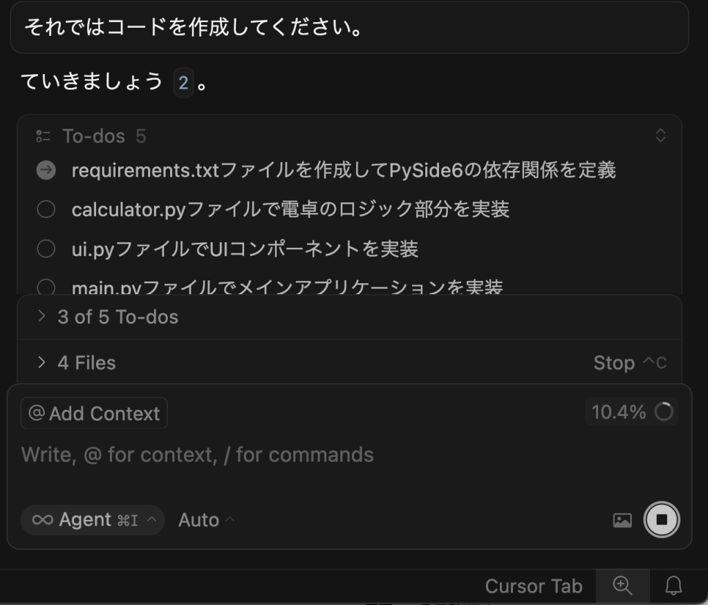 Cursorの場合、このAgentを通じてある特定のプログラムを完成させるために、「ファイルの作成」、「ファイルの読み込み」、「プログラムの作成」、「プログラムの実行テスト」などの処理を全て実行させることができる。