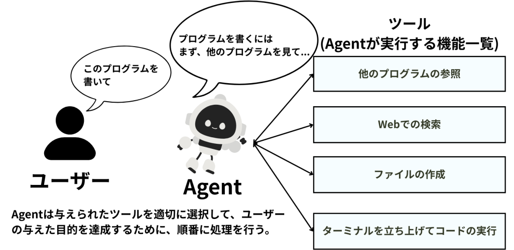 Agentというのは、複数の選択肢を与えてLLMを動かす仕組みのことである。